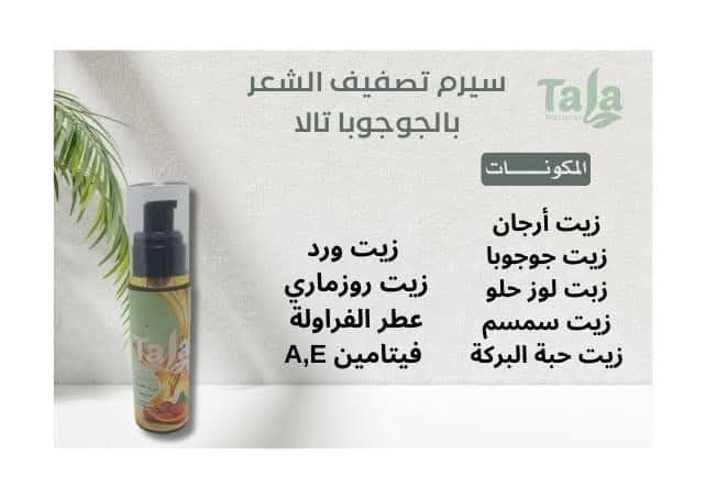 بشكل عام، منتجات واحة تالا تتميز بأنها خالية من المواد الكيميائية الضارة والسلفات، وتعتمد على زيوت ومكونات طبيعية 100%، تمنحك عناية صحية وآمنة عند الاستخدام المنتظم يضمن نتائج ملموسة في تحسين صحة الشعر والبشرة بطريقة طبيعية وبسيطة.